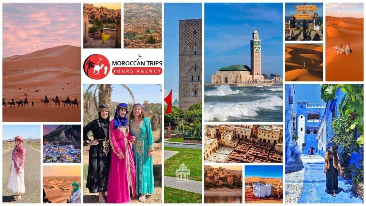 The tour includes Casablanca, Rabat, Chefchaouen, Fes, Merzouga (Sahara Desert), Todra Gorge, Dades Valley, Ouarzazate, Atlas Mountains, Essaouira, and Marrakech.