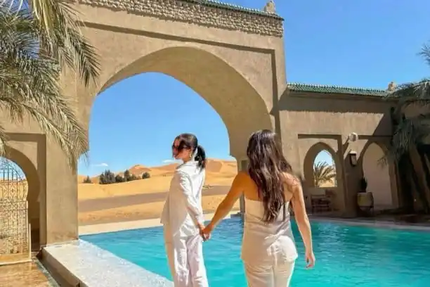 Start your day with a sunrise over the Sahara dunes After breakfast enjoy a 4-hour desert tour visiting a nomadic family M’ifis mines and Khamlia Village to hear Gnawa music. End with a peaceful walk in a desert oasis then relax at your nearby hotel for the night.