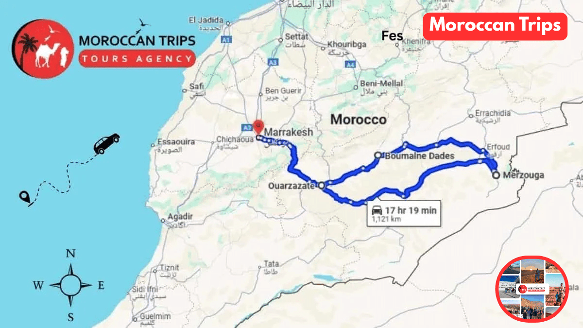 The journey during the 2 days tour from Marrakech to Merzouga takes around 9 to 10 hours each day including stops.